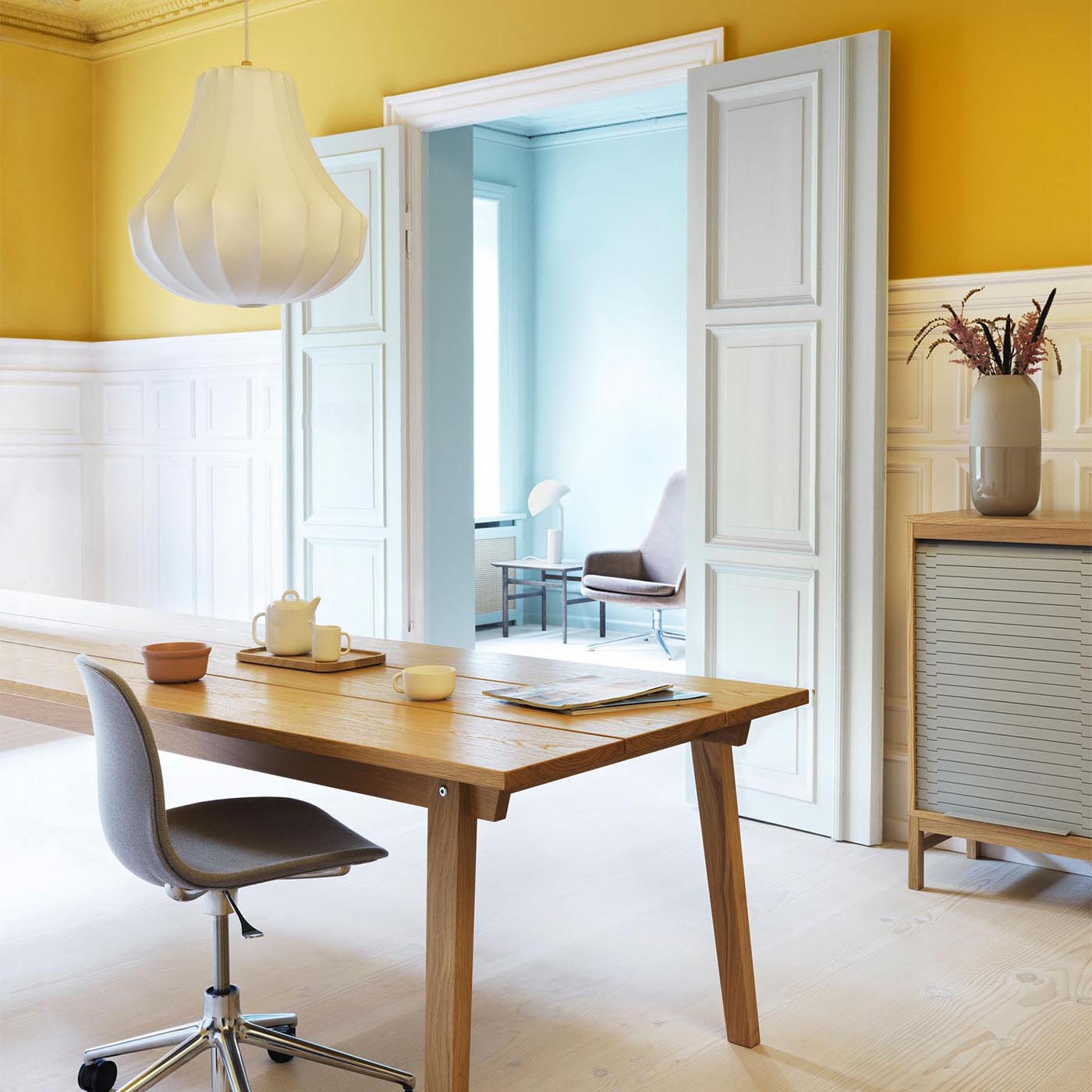 Whether as dining room table or as workplace – Slice impresses with its linear shapes, sturdy construction, and Scandinavian understatement. The combination with Hyg chairs or a simple pendant light.