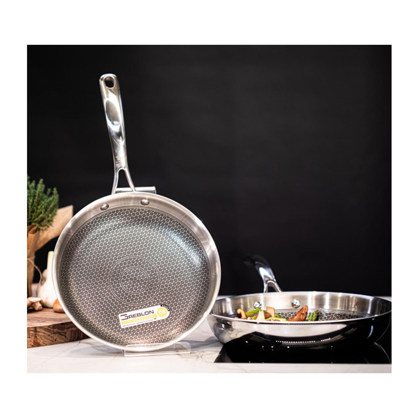 Made of stainless steel, interior stainless steel 18/8 -18/10, continuous aluminum core, exterior magnetic stainless steel, total material thickness approx. 2.5 mm, exterior highly polished, interior highly polished with honeycomb base: Weilburger C3 etching, the raised stainless steel structure perfectly protects the non-stick coating and is scratch-resistant, hot and crispy preparation at high temperatures, even heat distribution from the base to the edge, oil dosing system (Oil Optimizer) guarantees reduced use of oil, for low-fat, fat-free use, easy to clean, oven-safe up to 240°C, suitable for all types of stoves, including induction