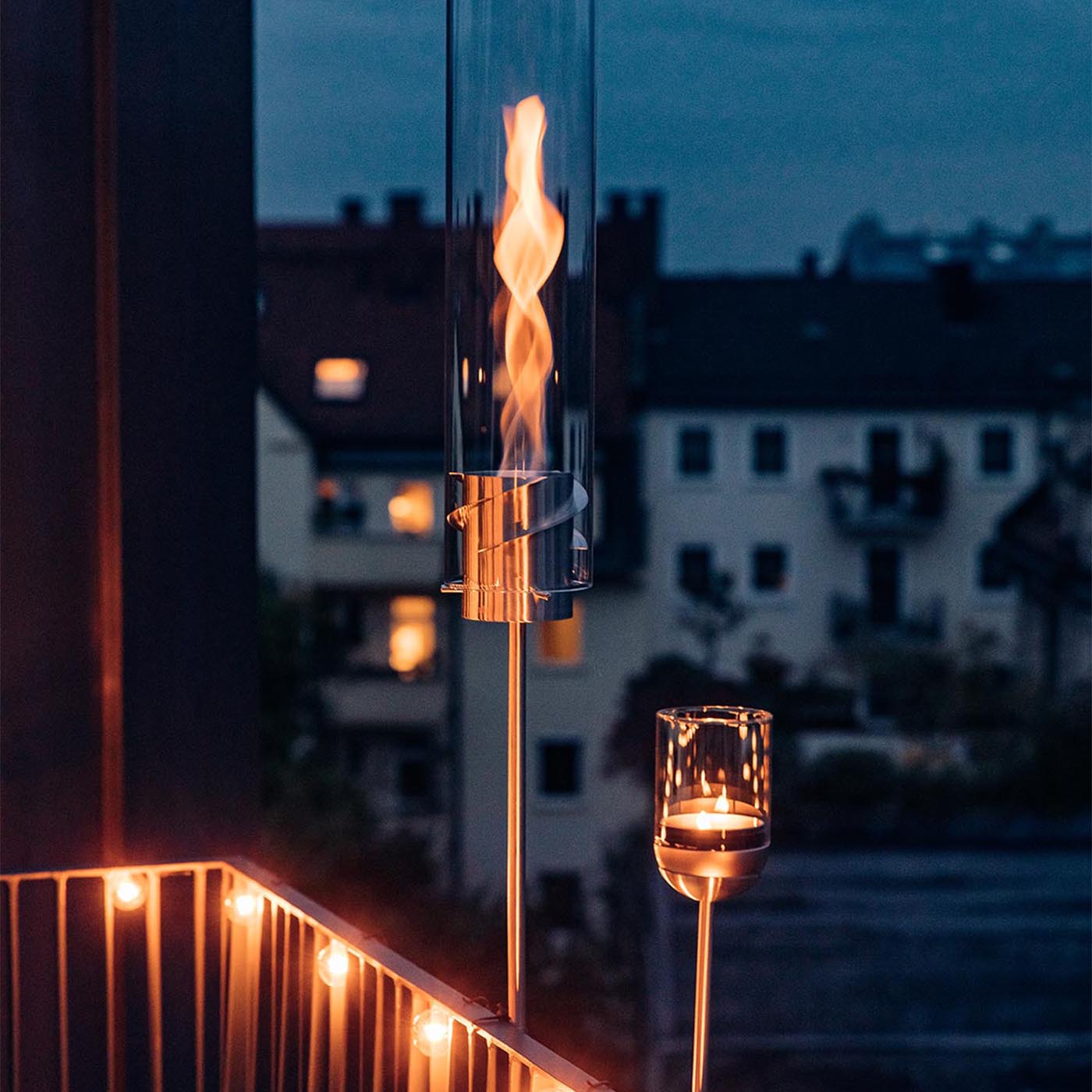 Table fire, lantern, garden torch, 500% boost through rotating flame and chimney effect, for indoor* and outdoor use (*only SPIN 120 Standard), more secure stand due to solid base, base with anti-slip, and surface protector, DIN EN 16647 compliant, burn time with one filling approx. 80 minutes, incl. extinguishing lid for early extinguishing of the flame, incl. a refill can made of stainless steel, housing made of stainless steel, glass cylinder made of borosilicate glass, high-quality silicone coating, fuel not included, optional accessories: elevation, ground spike