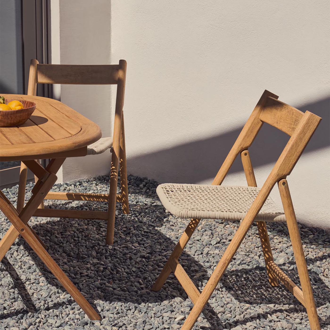 Variation: Natural wood grain and/or coloring, lighting and environmental conditions can distort the color perception of the product. Adjustable feet (yes/no): No Foot pad type: Plastic pad Removable seat (yes/no): No Main finish type: Painted with PU (polyurethane) varnish, UV resistance treatment Percentage of natural materials: > 25 Armrest cover removable (yes/no): No Assembly instructions: First attach the legs to the top. Check and sort the accessories before starting assembly. Install on a soft surface. Backrest removable (yes/no): No Leg material: Acacia wood (Acacia auriculiformis) Adjustable backrest (yes/no): No Seat material details: Rope, steel Backrest height: 28.0 Leg color: Natural Wood type: Acacia Button upholstery (yes/no): No Nailhead trim (yes/no): No Details Wood construction: Solid wood Frame construction: Metal, solid wood