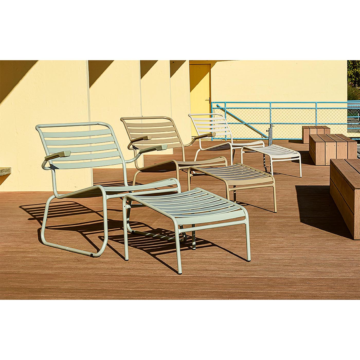 The chairs are also weatherproof and stackable. Available with or without armrests, with slats or as «Spaghetti» version, as bank or «Lounger» or in the high «Bar» version. You will find matching information in our Säntis Collection other products.