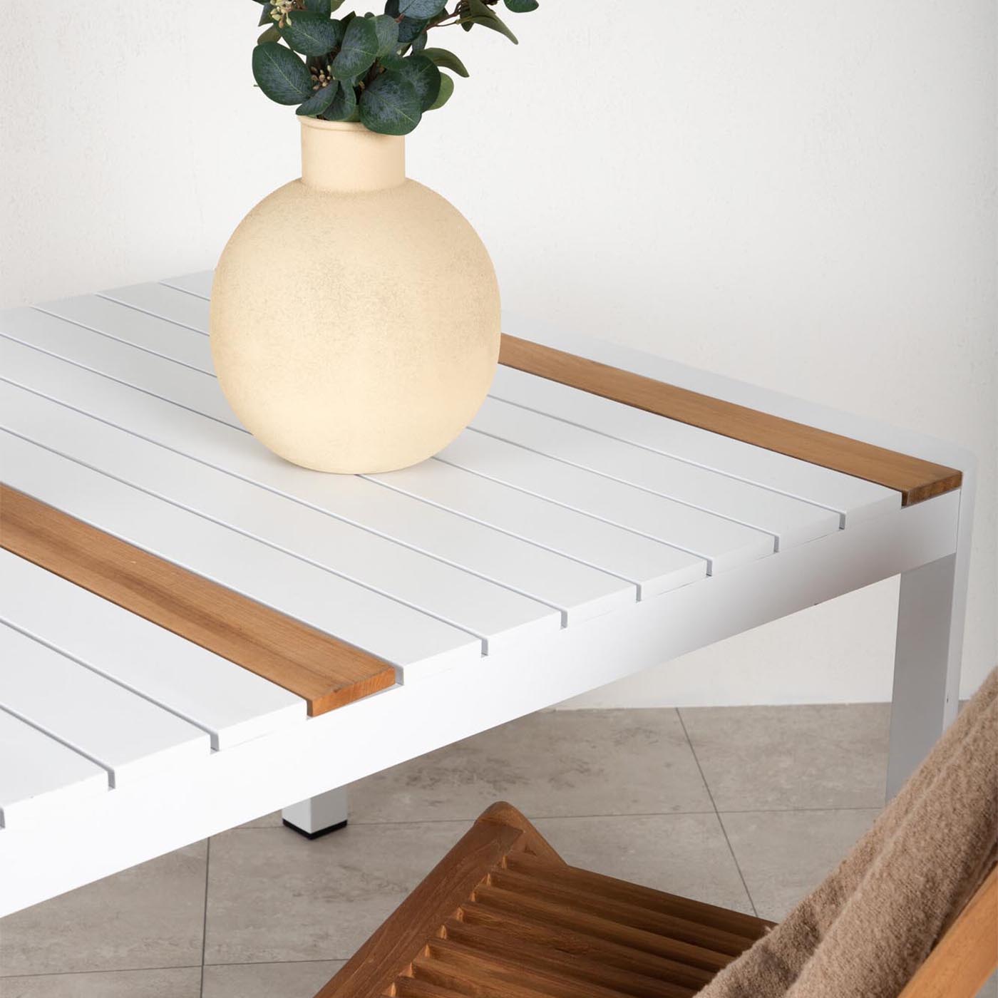 The rectangular Togo dining table impresses with its tasteful combination of black and wood-colored teak, which is not only visually appealing, but also for its Resilience The base frame is made of robust black aluminum ensures stability and longevity, while the table top with its fine Teak details a touch of Nature into your home.