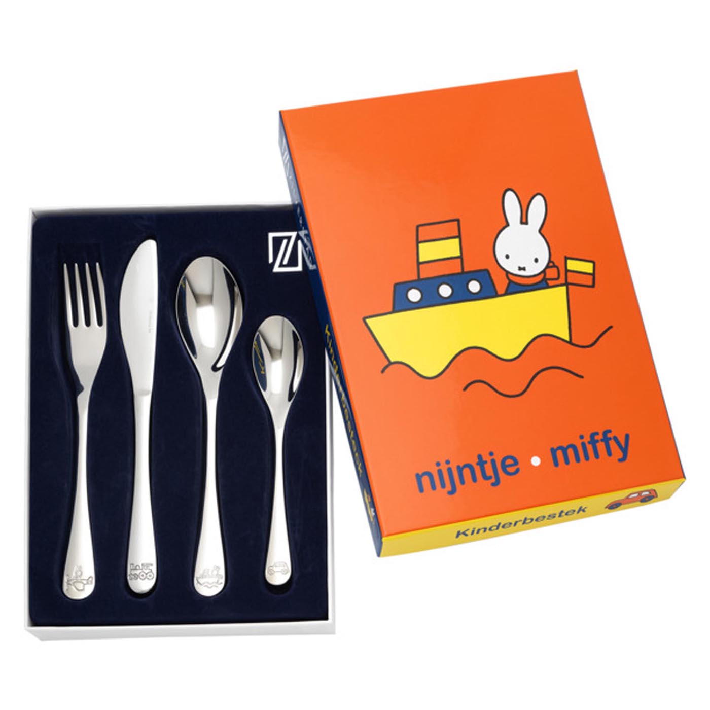 Children's cutlery made of high-quality 18/10 stainless steel with dinosaur images. The set is dishwasher safe and includes a fork, a knife, a spoon, and a small spoon.