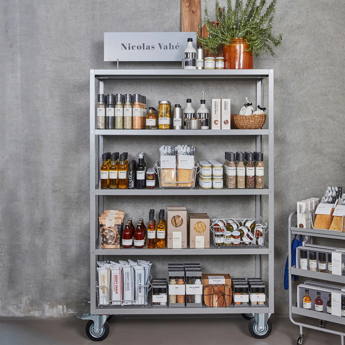 Stilvoller NVTrolley von Nicolas Vahé: Grauer Servierwagen mit 4 Rollen, ideal für Küche & Events, aus robustem Stahl, vielseitig & elegant. Mobiles graues Regal NVTrolley von Nicolas Vahé für flexible Lagerung.