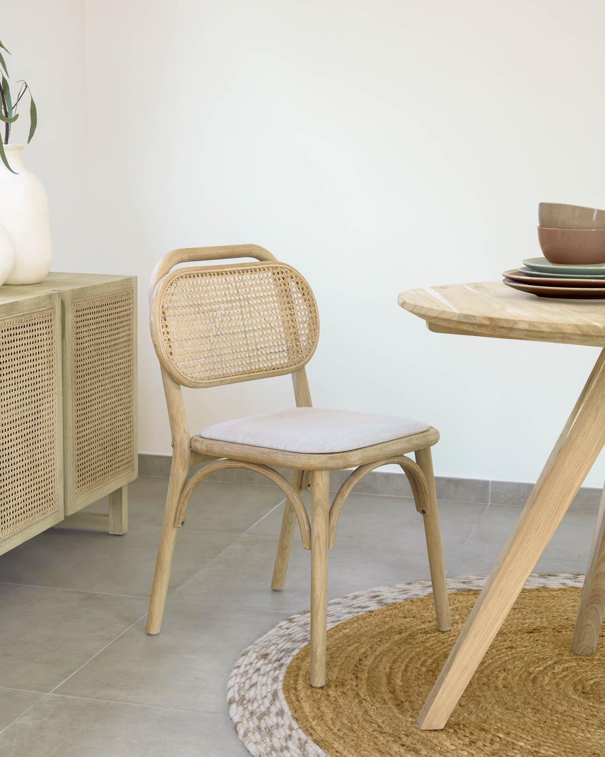 Die Eiche wurde mit einem Naturfinish behandelt, das die natürliche Maserung des Holzes hervorhebt und gleichzeitig Schutz bietet. Der handgeflochtene Rattanrücken verleiht dem Sessel eine luftige Leichtigkeit und sorgt für eine angenehme Rückenunterstützung. Passend dazu finden Sie in unserer Wohnzimmer-Kollektion weitere Möbelstücke, die perfekt harmonieren.