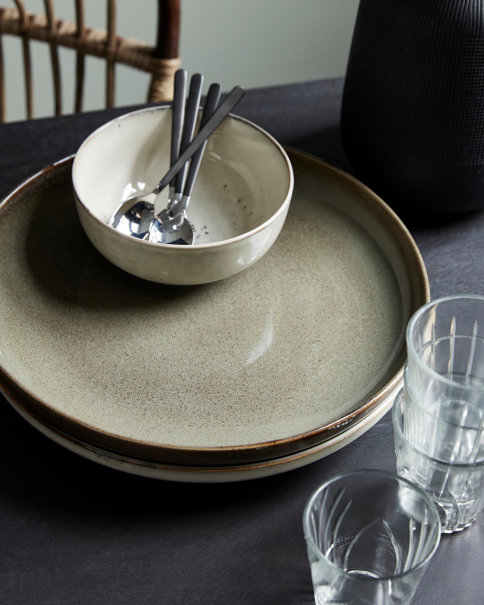 Der Steingut-Teller wurde mit einer grauen Glasur überzogen und mit kleinen Makeln geschmückt, die für einen rustikalen und entspannten Look sorgen. Kombiniere ihn mit unseren zeitlosen Besteck-Sets für ein harmonisches Gesamtbild.